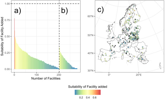 Fig. 4. Suitability of a facility added, i.e. the probability that a facility is added in one of the best performing runs (n = 25), illustrated in colour. The suitability depicted here is the mean of the three individual probabilities of addition in either the current, the RCP4.5 or the RCP8.5 facet. The dashed horizontal line depicts the maximally possible suitability of 1. (a) Includes all facilities that are suggested by both the representativity and the transferability analysis, (b) includes all facilities that are only suggested by the representativity analysis. The dashed vertical line separates the sub-panels (a) and (b). (c) Coloured points illustrate candidate facilities in (a) with their suitability of addition to eLTER RI. Black crosses illustrate all candidate facilities depicted in (b). Boundaries depict the study region and not necessarily accepted geographic boundaries.